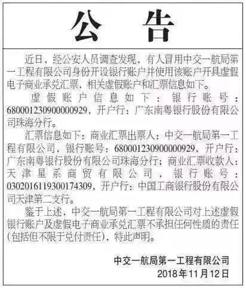 近日中鐵二局集團有限公司緊急發布公告稱,近期票據市場上出現興業銀行長春前進大街支行,以中鐵二局集團有限公司名義出具的電子商業承兌匯票,這批電子商業承兌匯票出票人為“中鐵二局集團有限公司”,開戶行為“興業銀行長春前進大街支行”。興業銀行長春前進大街支行不是中鐵二局集團有限公司的合作銀行,該商業承兌匯票不是中鐵二局集團有限公司出具。